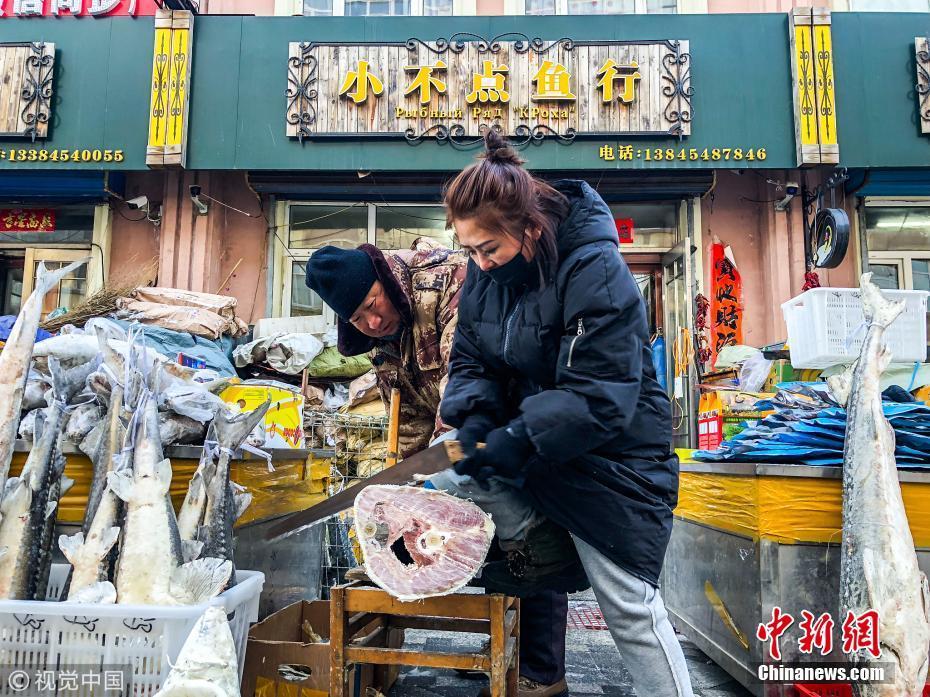 寒冬臘月是黑龍江撫遠(yuǎn)的凍魚銷售旺季。讓人大開眼界的是,一二百斤大魚得鋸開了賣;最讓魚販子開心的是,最多一天進(jìn)賬5萬元。魚販子半開玩笑地說:不是說數(shù)錢數(shù)到手抽筋嗎?進(jìn)錢最多的一天,還真差不多。圖為1月12日,黑龍江省佳木斯市撫遠(yuǎn)東極魚市,商戶在用鋸截?cái)鄡鲷~。棋簿紫 攝 圖片來源:視覺中國(guó)