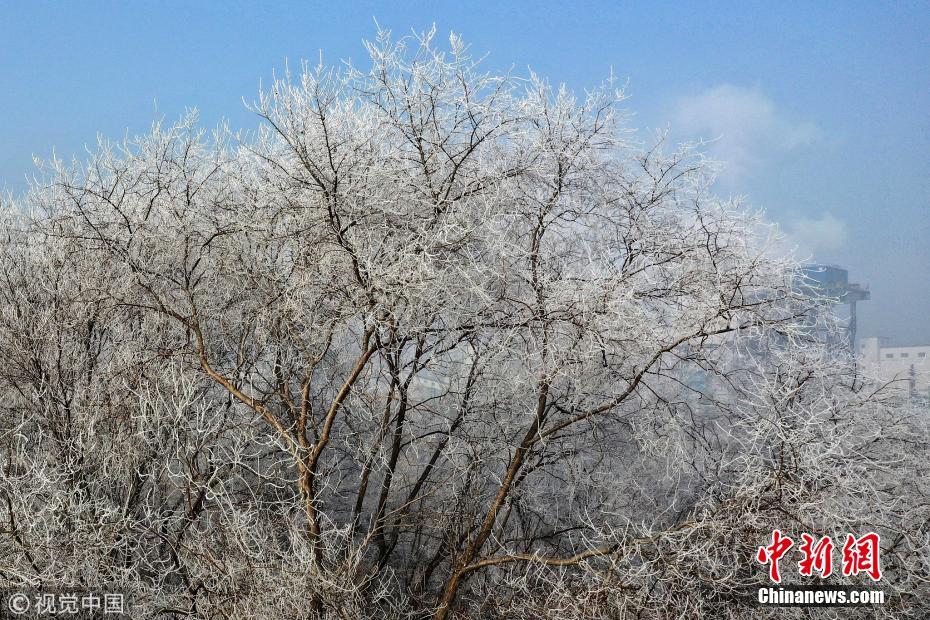 1月13日,霧散日升。河北省邢臺(tái)市大街小巷的樹(shù)枝上掛滿(mǎn)了潔白晶瑩的霜花,藍(lán)天下微風(fēng)吹拂銀絲閃爍,奇麗壯觀。給臘八節(jié)日增添了亮麗的風(fēng)景?;艏t軍 攝 圖片來(lái)源:視覺(jué)中國(guó)
