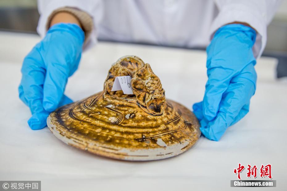 近日,廣東省博物館文物保護(hù)科技中心出水文物保護(hù)實(shí)驗(yàn)室里,一件修復(fù)后的出水明代老虎醬釉罐的蓋子。譚慶駒 攝 圖片來(lái)源:視覺(jué)中國(guó)