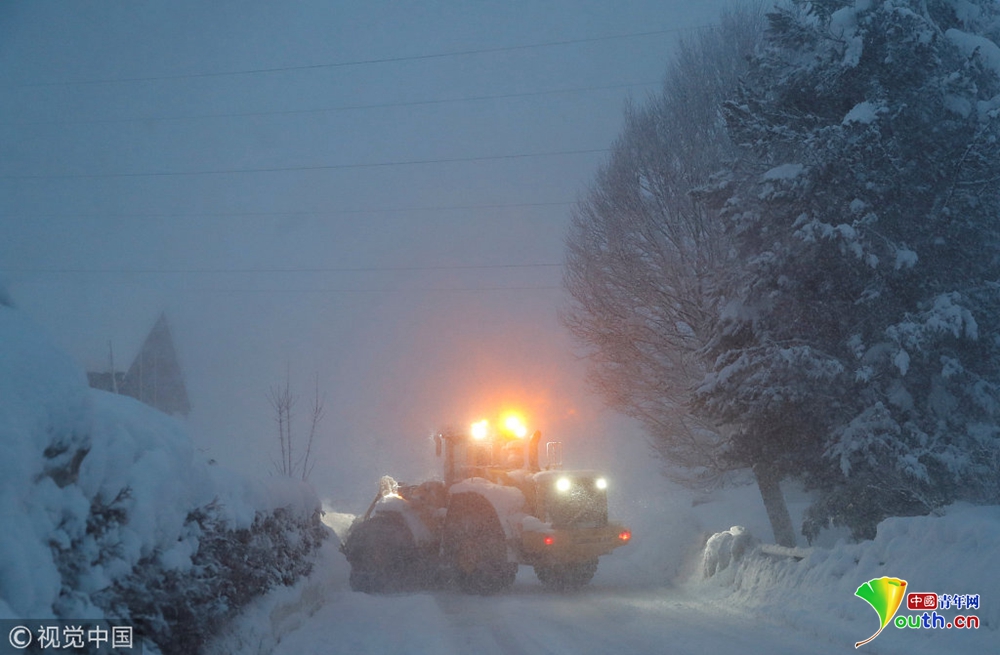 當?shù)貢r間2019年1月14日,奧地利Reitdorf,當?shù)卦庥霰╋L雪襲擊,公交車站被積雪掩埋。