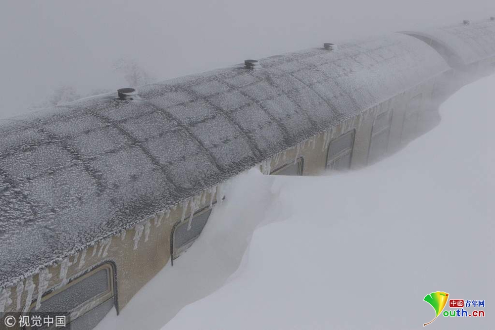 當?shù)貢r間2019年1月9日,德國錫爾克,一輛蒸汽火車被大雪困住無法前進。