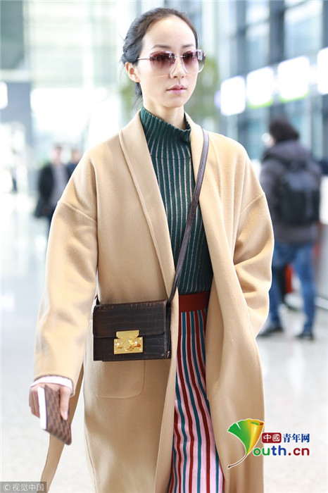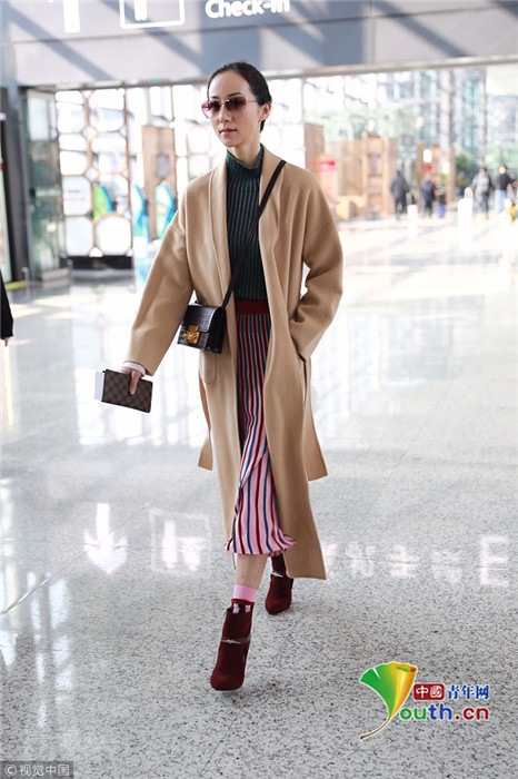 2019年1月17日,上海,韓雪現(xiàn)身機場,穿著條紋紗裙露出小腿,十分抗凍,她搭配經(jīng)典的駝色大衣,氣質(zhì)出眾在機場人群中相當搶鏡。