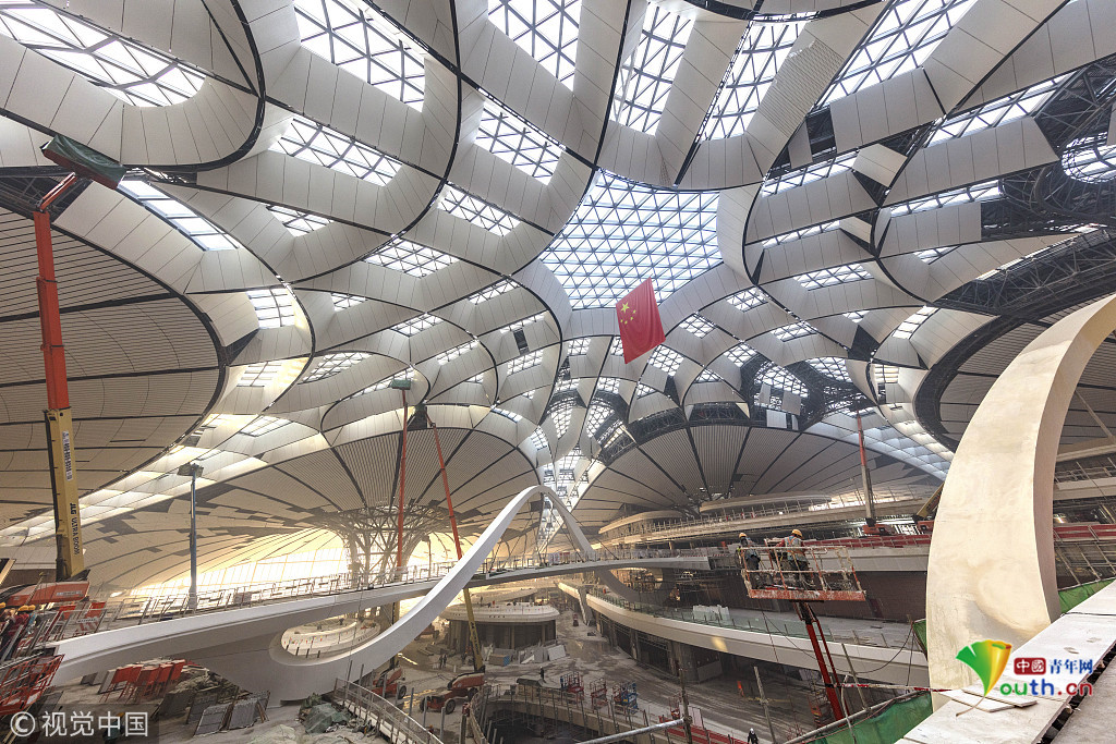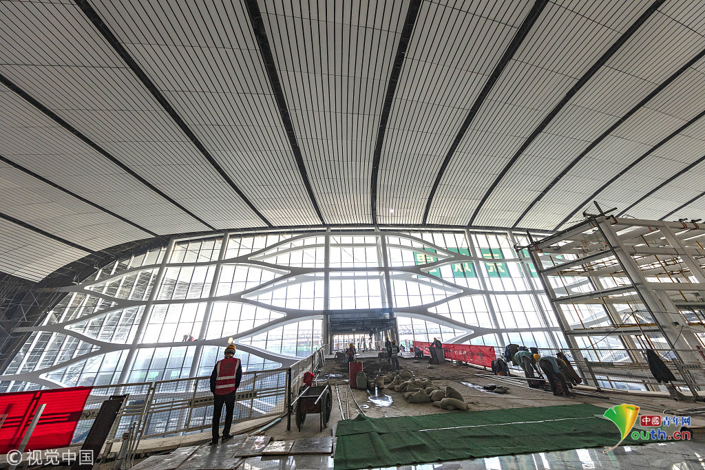 2018年12月19日,北京大興國(guó)際機(jī)場(chǎng)航站樓的屋面已基本完工,一只金色“鳳凰”完整地出現(xiàn)在北京城南。航站樓的室內(nèi)裝修在有條不紊的推進(jìn)中。