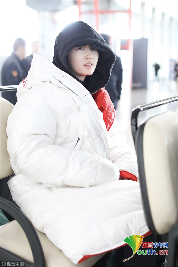 1月23日,北京,周冬雨現(xiàn)身機場。她用黑色連衣帽罩頭襯托巴掌臉,把下巴擱在行李車推桿上的雙手上呆萌可愛 。
