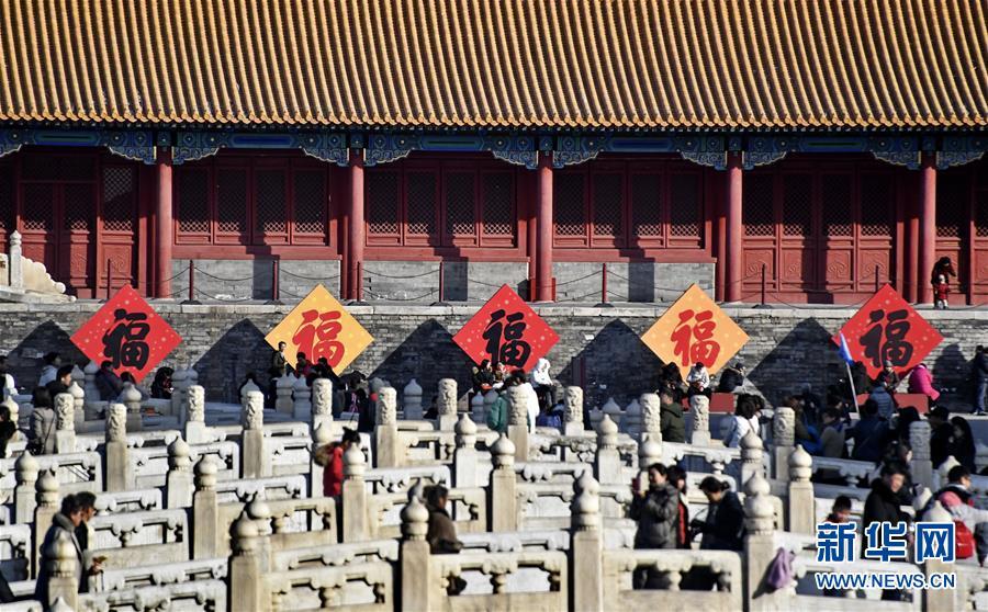 1月25日,游人在故宮內(nèi)的“五福”前留影。 春節(jié)將至,北京故宮博物院內(nèi)張燈結(jié)彩,到處懸掛著宮燈、萬(wàn)壽燈、年畫、門神、福字等古代宮廷節(jié)日裝飾品,讓來(lái)自國(guó)內(nèi)外的游人感受到濃濃的年味。 新華社記者 李欣攝