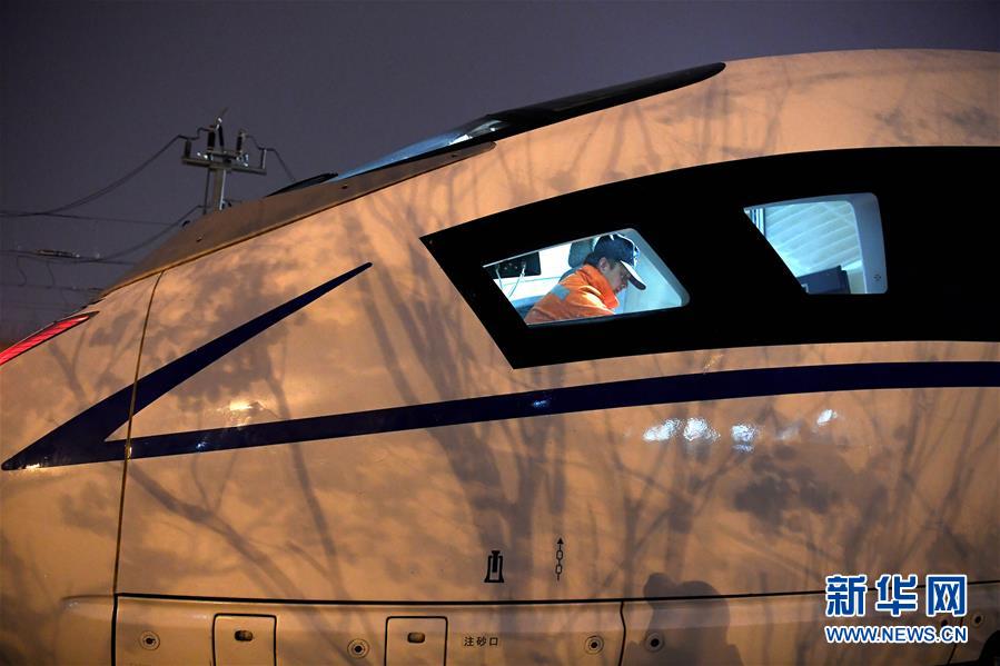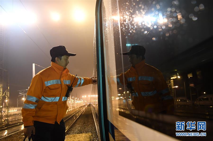 1月29日,王瑞在合肥南動車運用所存車場走向下一輛動車。新華社記者劉軍喜攝
