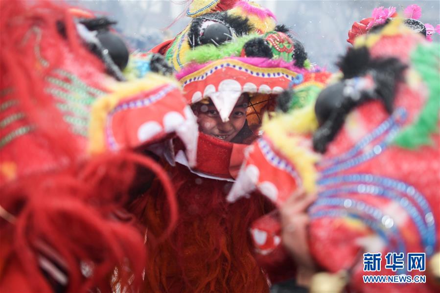 2月16日,社火隊演員在青海省大通回族土族自治縣文化廣場表演。新華社記者吳剛攝