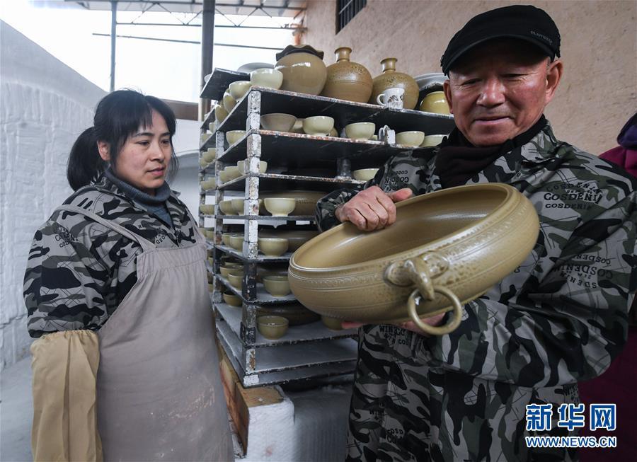 2月16日,陳新華(右)查看農歷新年第一窯燒制好的婺州窯作品。新華社記者 徐昱 攝