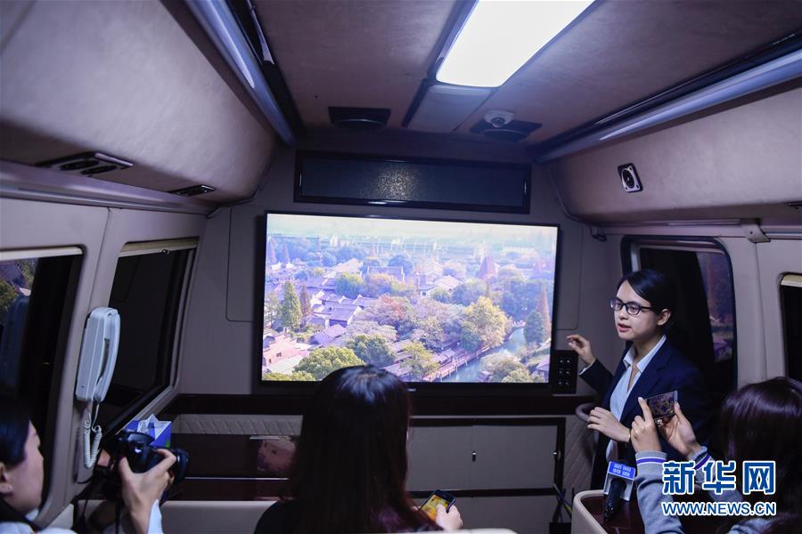 在浙江移動烏鎮(zhèn)分水墩營業(yè)廳外,工作人員在一輛體驗巴士內(nèi)介紹通過5G移動傳輸技術(shù)實現(xiàn)的8K高清的視頻畫面實時展示(10月30日攝)。 新華社記者黃宗治攝