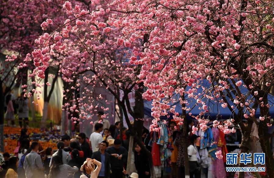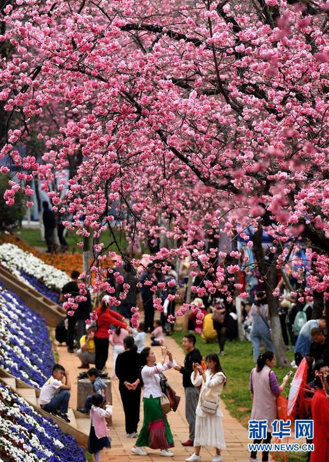 游人在昆明圓通山公園觀賞盛開的櫻花(3月16日攝)。近日,云南省昆明市迎來櫻花盛開的時節(jié)。昆明圓通山公園的數千株櫻花燦爛綻放,吸引了市民和游客前來觀花賞景。新華社記者藺以光攝