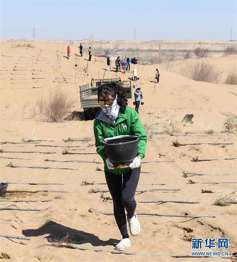 3月31日,一名青年志愿者正在取水澆灌。 當日,200余名中韓兩國青年志愿者來到內蒙古自治區(qū)達拉特旗庫布其沙漠種樹。2006年起,中國國際青年交流中心與韓國韓中文化青少年協(xié)會組織兩國青年志愿者在庫布其沙漠植樹,參與防沙固沙項目。截至目前已植樹850多萬株,造林3萬多畝。 新華社記者 劉磊 攝