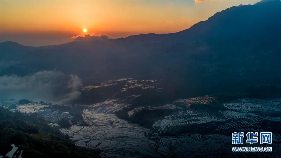 這是在云南省元陽縣拍攝的晨曦中的哈尼梯田美景(4月4日無人機(jī)拍攝)。哈尼梯田位于云南省哀牢山南部,以哈尼族為主的當(dāng)?shù)厝罕娗О倌陙砩幌⒃诖蟮厣稀暗窨獭背鲞@一農(nóng)耕文明奇觀。春日里,漫山的水稻梯田與云海、森林、村莊形成一幅美麗的畫卷,吸引眾多海內(nèi)外游客前來觀賞。新華社記者 胡超 攝