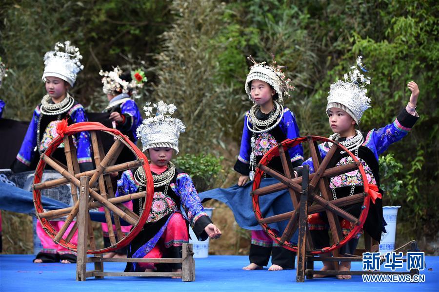 幾名苗族女孩在參加非遺手工藝展演活動(dòng)(4月6日攝)。4月6日至7日,在貴州省黔東南苗族侗族自治州劍河縣觀么鎮(zhèn)新民村和新合村,來自劍河縣和三穗縣的苗族同胞歡聚一堂,通過民族歌舞展演、非遺手工藝展示、千戶祭“巫耶”、跳蘆笙舞等形式,與來賓一起歡慶2019年高雍苗族“三月三”民俗文化節(jié)。 新華社記者 楊文斌 攝