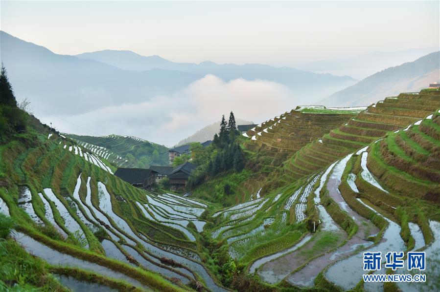 龍勝各族自治縣和平鄉(xiāng)平安村一景(4月7日攝)。連日降雨過(guò)后,廣西龍勝各族自治縣和平鄉(xiāng)平安村的壯族村寨迎來(lái)久違的朝陽(yáng)。 新華社記者 曹祎銘 攝