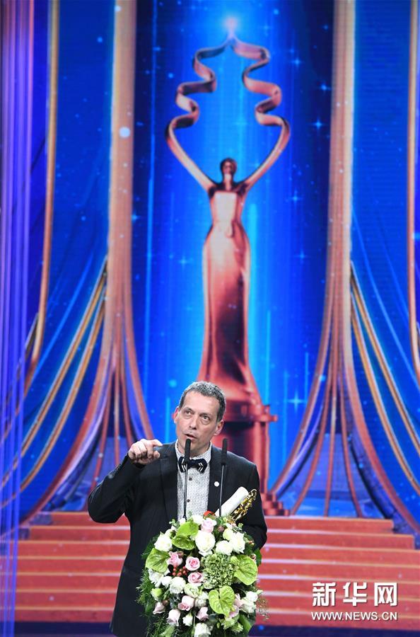 4月20日,影片《侍者》獲得“天壇獎最佳音樂獎”,領(lǐng)獎?wù)咴陬C獎典禮上發(fā)表獲獎感言。 當(dāng)日,第九屆北京國際電影節(jié)閉幕式暨頒獎典禮在北京懷柔國家中影數(shù)字制作基地舉行。 新華社記者 陳曄華 攝