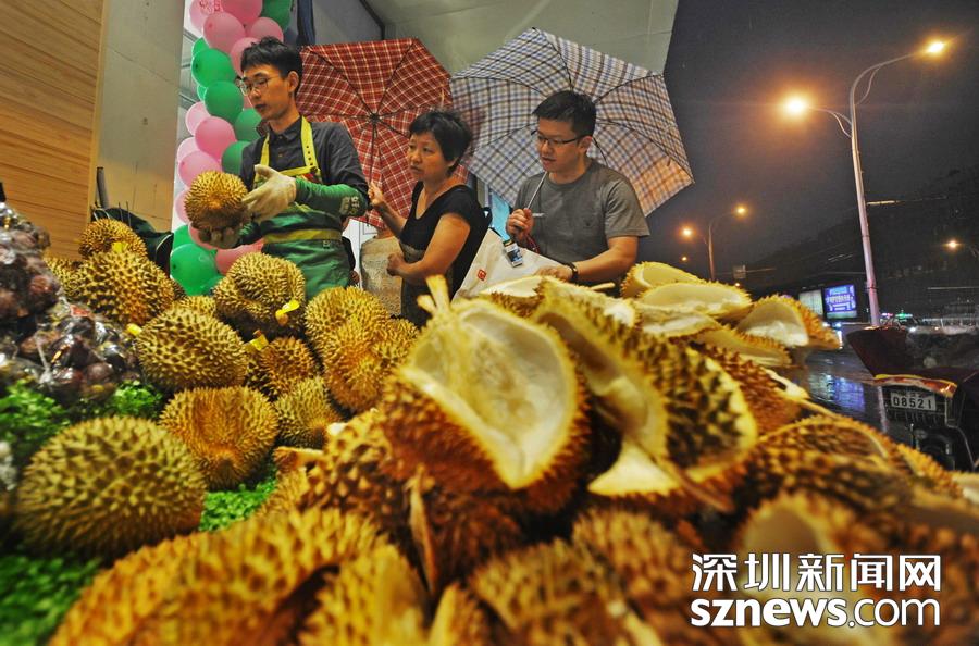 2017年6月5日夜里,武漢一家水果店正進行金枕榴蓮打折促銷,門前堆積如山的榴蓮殼頗為壯觀,不少市民聞著榴蓮散發(fā)的濃郁味道前來排隊選購,雨夜里食客們依舊絡繹不絕。
