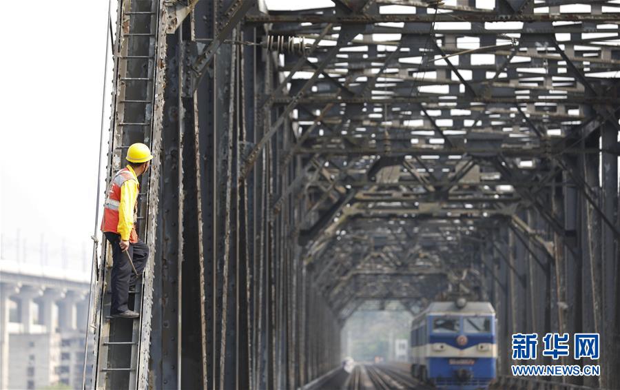 中國鐵路成都局有限公司重慶工務段的巡檢班組在白沙沱長江大橋上等待機車通過后繼續(xù)作業(yè)(4月23日攝)。 4月23日下午5點40分,隨著重慶白沙沱長江大橋通行的最后一列客運列車順利通過,這座“服役”了59年的重慶首座長江大橋進入“退役”倒計時。4月24日后,所有列車將改線經(jīng)距白沙沱長江大橋約100米的新白沙沱長江特大橋通行,新橋“接力”老橋,運輸能力將得到大幅提升。 白沙沱長江大橋于1958年開工,1960年通過首趟列車,是繼武漢長江大橋之后的第二座長江大橋。 新華社記者 劉潺 攝