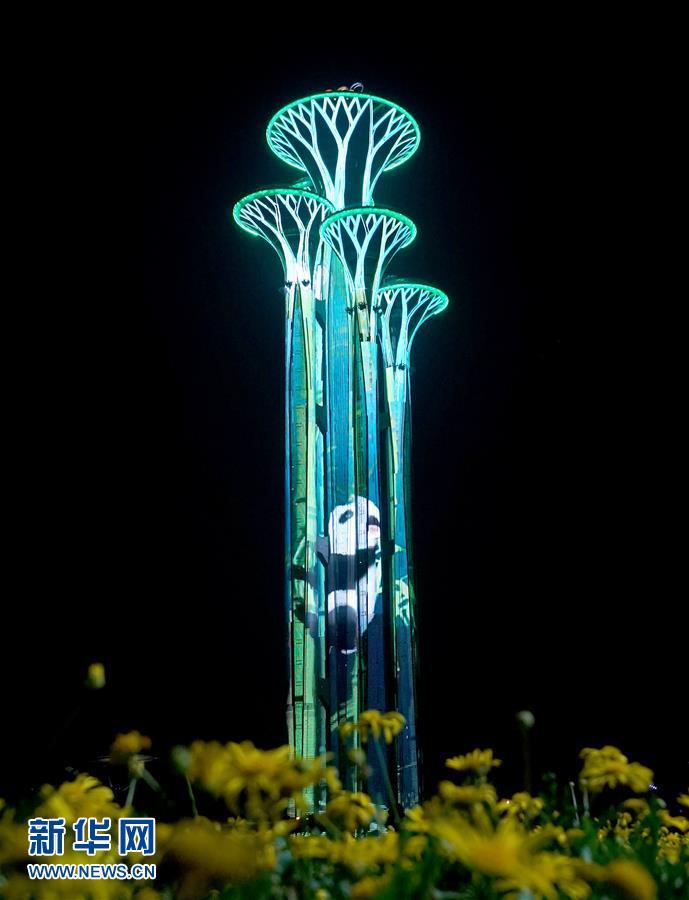 奧林匹克塔上演“空間光影秀”(5月14日攝)。 當晚,一場“空間光影秀”在北京上演。 新華社記者 陳建力 攝