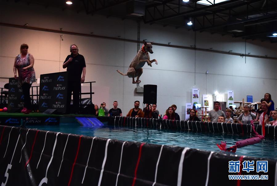 5月19日,在德國多特蒙德舉行的寵物展上,一只獵犬參加跳水比賽。 為期三天的德國多特蒙德“狗和貓”寵物展19日落幕。寵物展期間,人們帶著自己的“萌寵”來到會場,參與寵物跳水、舞蹈、選美等趣味比賽,并與其他寵物愛好者及展商交流互動。 新華社記者逯陽攝