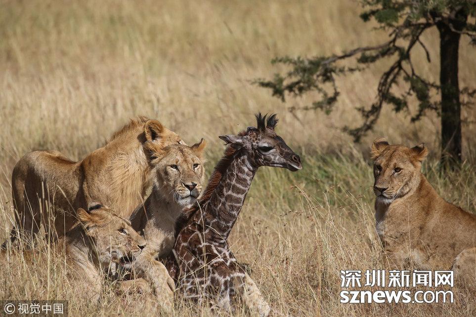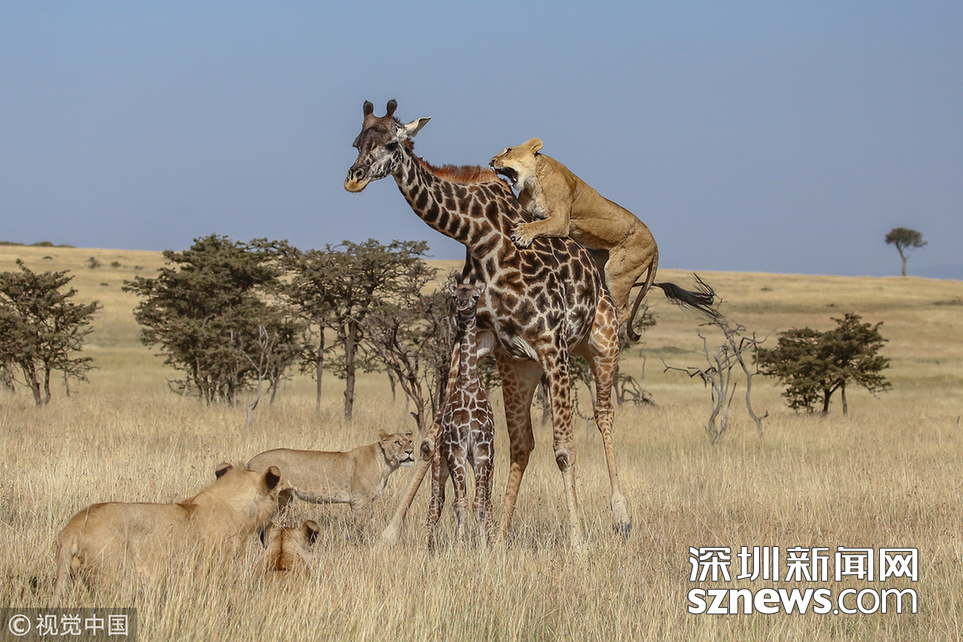 深圳新聞網(wǎng)訊 當(dāng)?shù)貢r(shí)間2018年8月15日,肯尼亞馬賽馬拉,當(dāng)?shù)貙?dǎo)游詹姆斯·納帕索(James Nampaso)拍攝到一群獅子圍攻母長(zhǎng)頸鹿和她的幼崽。盡管長(zhǎng)頸鹿勇敢地抵抗獅群的進(jìn)攻,但當(dāng)一頭母獅跳上它的脊背時(shí),它被分散了注意力,使得獅群最終捕獲了它的孩子。