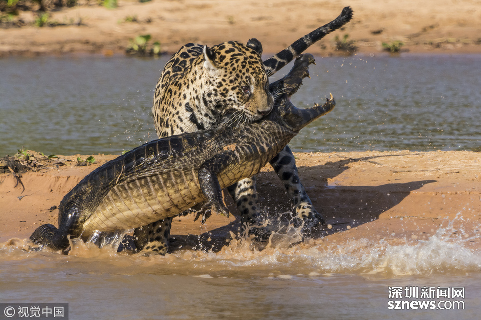 當(dāng)?shù)貢r(shí)間2013年8月25日,巴西潘特納爾,一頭雄性美洲豹攻擊了一條巴拉圭凱門(mén)鱷并與之纏斗。這只美洲豹預(yù)先躲在水中匍匐前進(jìn),然后突然出現(xiàn)把這只鱷魚(yú)震住,隨后用牙刺進(jìn)鱷魚(yú)的堅(jiān)硬的外殼中,將其拖入?yún)擦帧?/p>