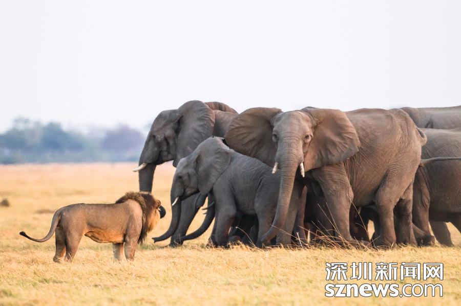 英國(guó)攝影師詹姆斯(James Gifford)在博茨瓦納喬貝國(guó)家公園拍到一群獅子獵食大象的精彩畫(huà)面。在詹姆斯的鏡頭下,一頭母獅跳到了一頭小象的背上想要將其拿下,但僅憑一己之力又不能做到。但當(dāng)母獅的后援抵達(dá)時(shí),象群也趕到了現(xiàn)場(chǎng)。最終,小象回到了象群中獲得庇護(hù),而獅群也不得不悻悻離去。