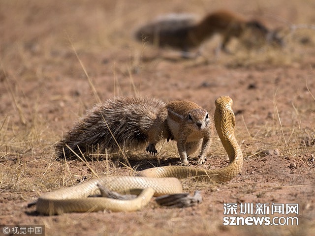當?shù)貢r間2016年10月25日,南非博茨瓦納的卡格拉格帝越界公園, 眼鏡蛇和地松鼠之間發(fā)生激烈打斗,但都沒有受傷。野生動物攝影師Hannes Rossouw拍攝了這一過程。