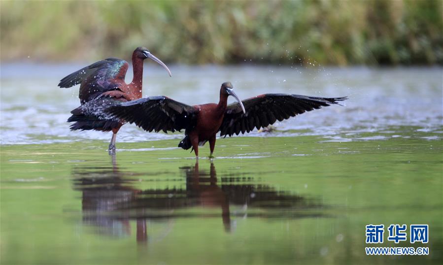 這是在漢江濕地公園嬉水的2只彩鹮(5月4日攝)。 近日,國(guó)家二級(jí)保護(hù)動(dòng)物彩鹮現(xiàn)身陜西省漢中市漢江濕地公園濂水河與漢江交匯處。 據(jù)陜西師范大學(xué)生命科學(xué)院教授于曉平介紹,彩鹮在世界上的分布比朱鹮還要少,這幾年在云南發(fā)現(xiàn)得多一些,這3只彩鹮現(xiàn)身漢江濂水河畔,是陜西首次發(fā)現(xiàn)彩鹮蹤跡。 據(jù)了解,彩鹮是國(guó)家二級(jí)保護(hù)動(dòng)物,屬鵜形目鹮科,體羽大部為青銅栗色,是珍稀鳥(niǎo)類(lèi)朱鹮的“近親”,體型比朱鹮略小。 新華社發(fā)