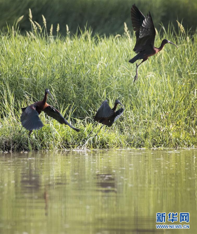 這是在漢江濕地公園飛翔的3只彩鹮(4月29日攝)。 近日,國家二級保護(hù)動物彩鹮現(xiàn)身陜西省漢中市漢江濕地公園濂水河與漢江交匯處。 據(jù)陜西師范大學(xué)生命科學(xué)院教授于曉平介紹,彩鹮在世界上的分布比朱鹮還要少,這幾年在云南發(fā)現(xiàn)得多一些,這3只彩鹮現(xiàn)身漢江濂水河畔,是陜西首次發(fā)現(xiàn)彩鹮蹤跡。 據(jù)了解,彩鹮是國家二級保護(hù)動物,屬鵜形目鹮科,體羽大部為青銅栗色,是珍稀鳥類朱鹮的“近親”,體型比朱鹮略小。 新華社發(fā)(陶本耀 攝)