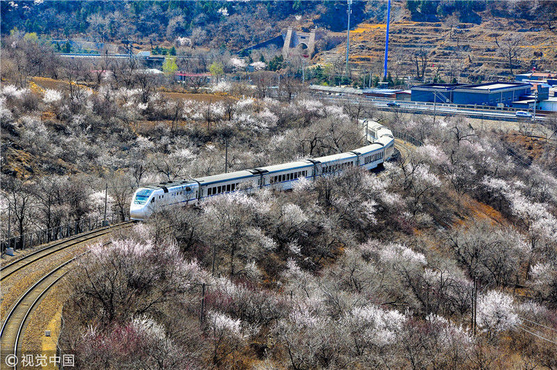 2019年3月22日,北京居庸關(guān)附近的山花盛開,S2線列車穿行在花海之中,構(gòu)成一幅美麗的畫面。時永平/千龍圖像/視覺中國 編輯/陳進(jìn)