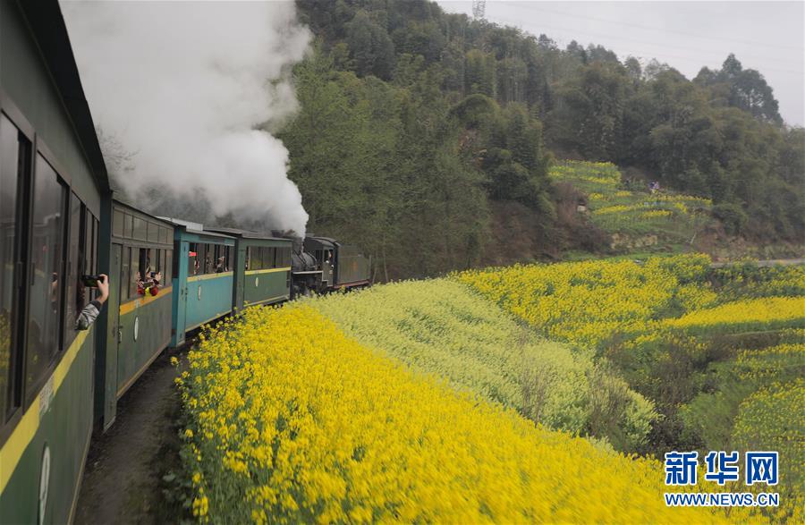 初春時節(jié),在花海中穿行的嘉陽小火車迎來了每年的旅游旺季,眾多游客慕名前來乘坐。