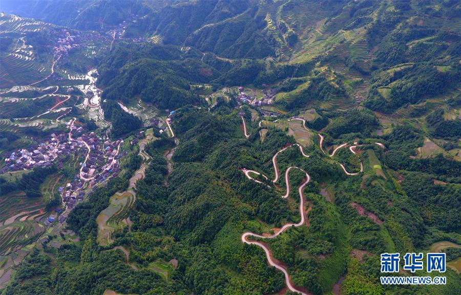 這是融水苗族自治縣桿洞鄉(xiāng)百秀村孔門苗寨的公路(6月14日無人機(jī)拍攝)。新華社記者 黃孝邦 攝