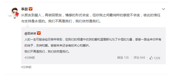 李晨隨即轉(zhuǎn)發(fā),回應(yīng)道"從朋友到愛人,再做回朋友,情感的形式會(huì)變,但你我之間最純粹的感受不會(huì)變,彼此的信任與支持是永恒的。我們不再是我們,我們依然是我們。