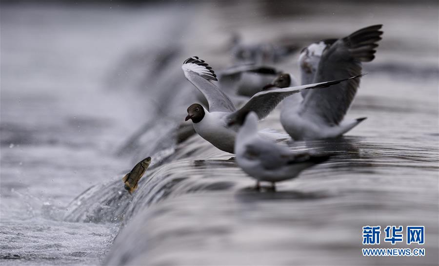 7月6日,在青海省剛察縣沙柳河里,幾只棕頭鷗在捕捉躍起的湟魚。 新華社記者 費(fèi)茂華攝