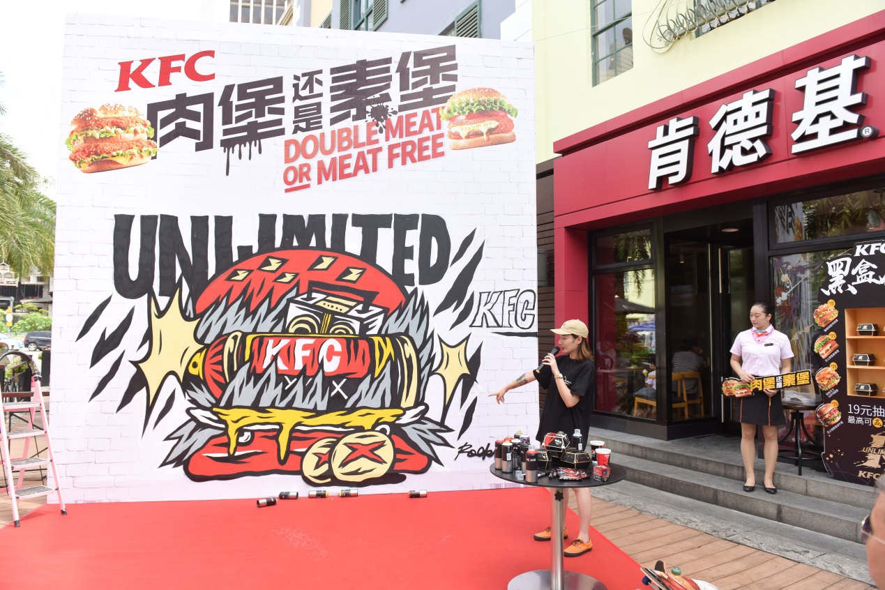 “肯德基是我非常喜歡的品牌,新潮、時(shí)尚。這一次與KFC的涂鴉合作,我在漢堡涂鴉的畫面中融入了像滑板、打碟機(jī)這樣的潮流元素,來演繹KFC厚菇堡這一款極具創(chuàng)新性的漢堡。用噴漆罐表現(xiàn)一整塊芝士厚菇,一口咬下能噴出濃郁的芝士;火焰燃燒的造型代表漢堡中肆意的醬汁,增加視覺沖擊感,呈現(xiàn)出一個(gè)沒有肉,但很real的霸氣素漢堡?!闭劶皠?chuàng)作理念,ROCKLEE說道,“這種結(jié)合我覺得很有意義,一方面展現(xiàn)了涂鴉這種街頭文化多元的一面,另一方面也傳遞出KFC在漢堡界young OG的全新形象?!睆膭?chuàng)作到完工,整個(gè)過程都引來路人圍觀、拍照。從朋友圈看到消息的潮人又不斷向此聚集、花式打卡。