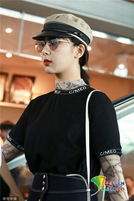 2019年7月25日,北京,楊紫現(xiàn)身機(jī)場。她穿黑色短T配牛仔裙變時(shí)髦女郎,戴報(bào)童帽架墨鏡”港風(fēng)女sir“即視感,人氣爆棚。