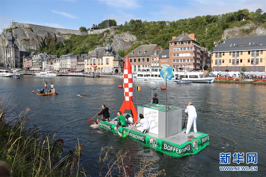 8月15日,在比利時南部小城迪南的默茲河上,人們參加“浴缸劃船節(jié)”的表演。新華社記者 張鋮 攝