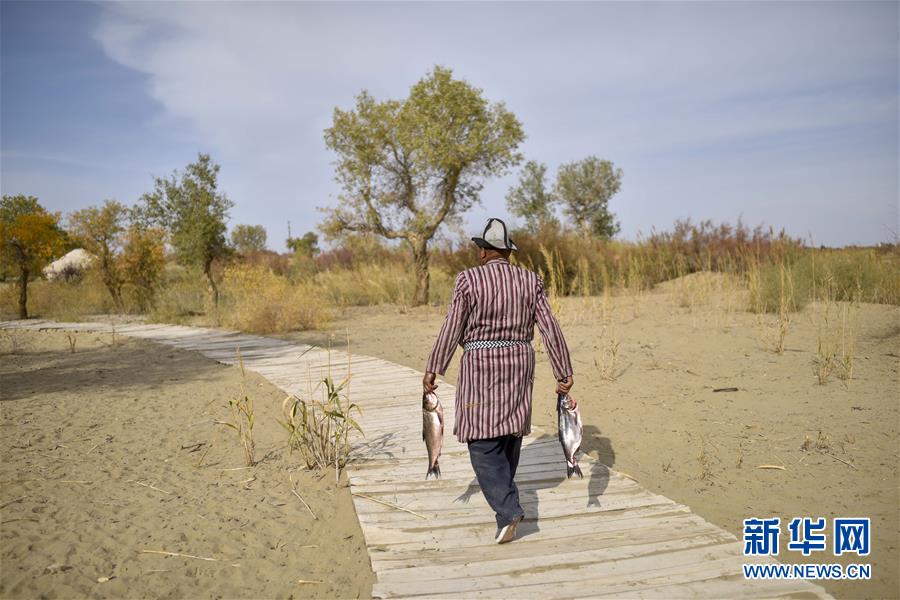 在羅布人村寨,阿木東·艾不東拎著兩條洗好的魚(yú)準(zhǔn)備制作羅布烤魚(yú)(2018年10月16日攝)。新華社記者 趙戈 攝