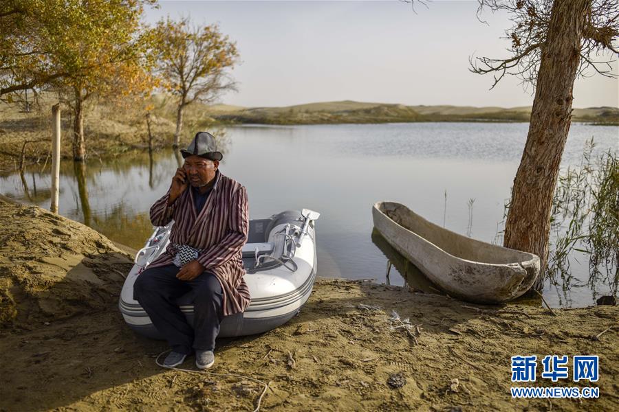 在羅布人村寨,阿木東·艾不東坐在湖邊接電話(2018年10月16日攝)。在旅游旺季,游客會(huì)通過(guò)電話提前向阿木東預(yù)約羅布烤魚(yú)。新華社記者 趙戈 攝