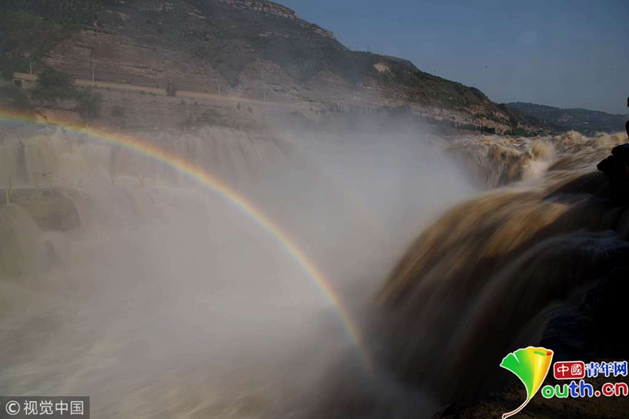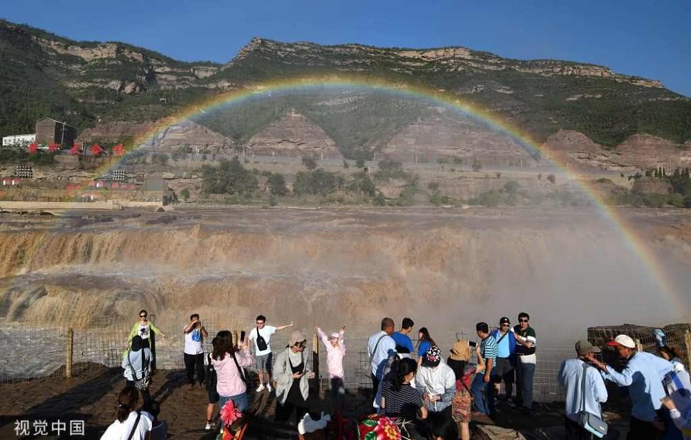 入秋以來(lái),山西吉縣黃河壺口瀑布景區(qū)天氣晴好,黃河干流水量豐沛,壺口瀑布飛濺的浪花和水霧在陽(yáng)光的照射下,形成“彩虹門”景觀,吸引了眾多游客。