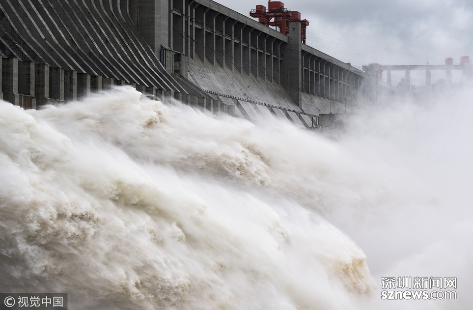 2018年7月5日,湖北宜昌,江水通過(guò)三峽大壩泄洪深孔下泄。
