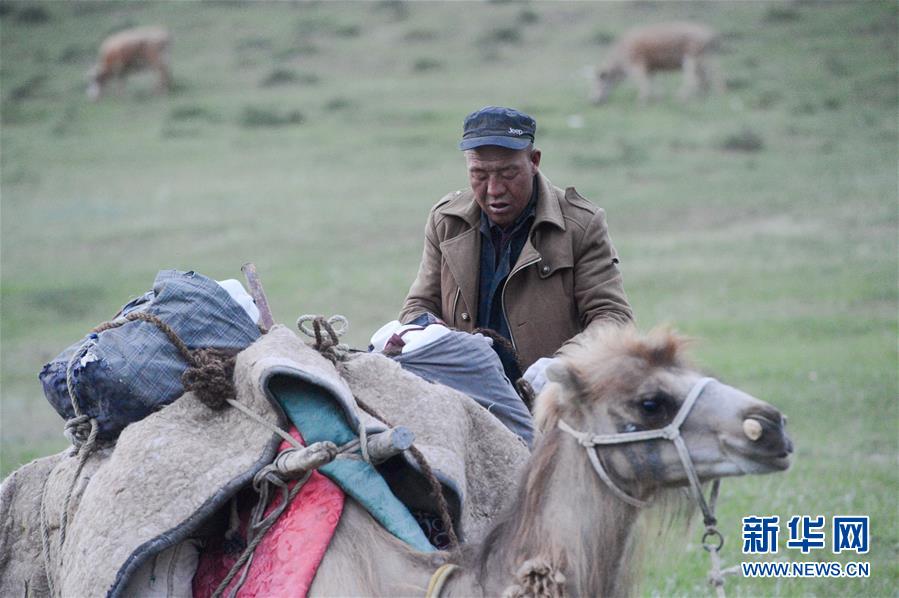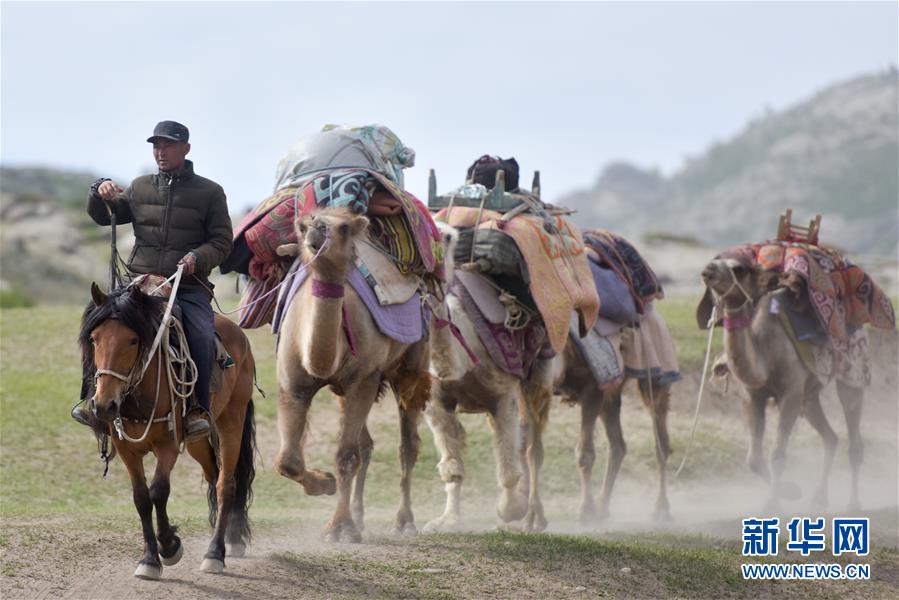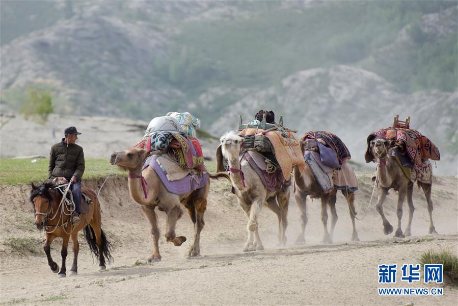 6月6日,新疆阿勒泰地區(qū)福??h牧民帶著駝隊(duì)行進(jìn)在轉(zhuǎn)場(chǎng)途中。 新華社記者 丁磊 攝