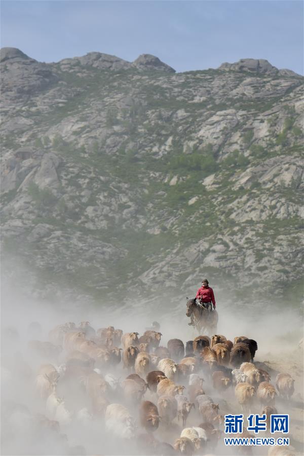6月6日,新疆阿勒泰地區(qū)福??h牧民趕著轉(zhuǎn)場牲畜翻越山頭。 新華社記者 丁磊 攝