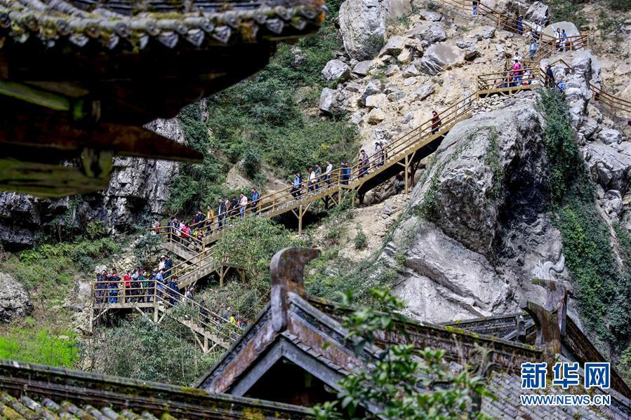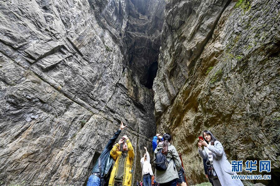 游客在天生三橋景區(qū)內(nèi)的天龍橋景點(diǎn)游覽(3月27日攝)。 新華社記者劉潺攝