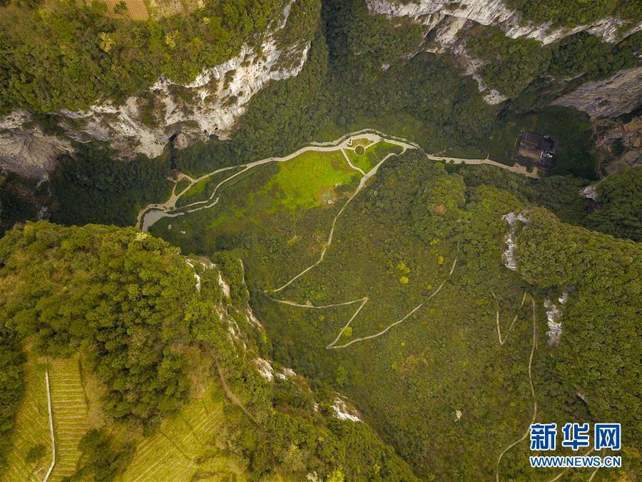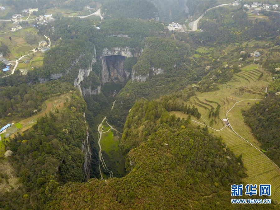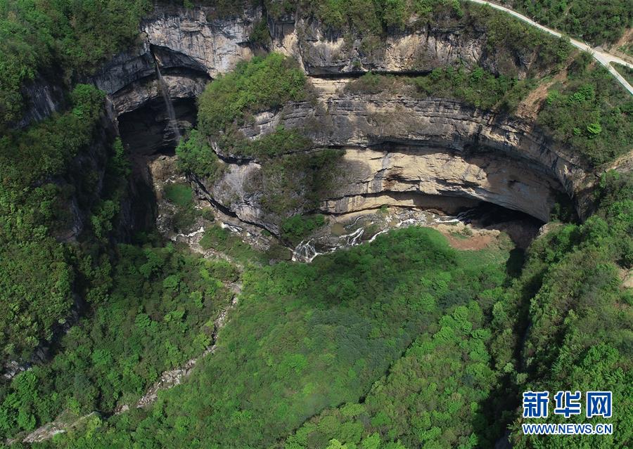4月22日無人機(jī)拍攝的地洞河天坑。 新華社記者 張博文 攝