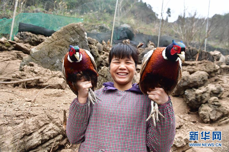 龍革雄的妻子羅桂枝在展示養(yǎng)殖的山雞(2月4日攝)。 新華社記者 黃孝邦 攝