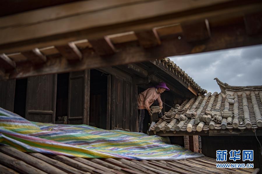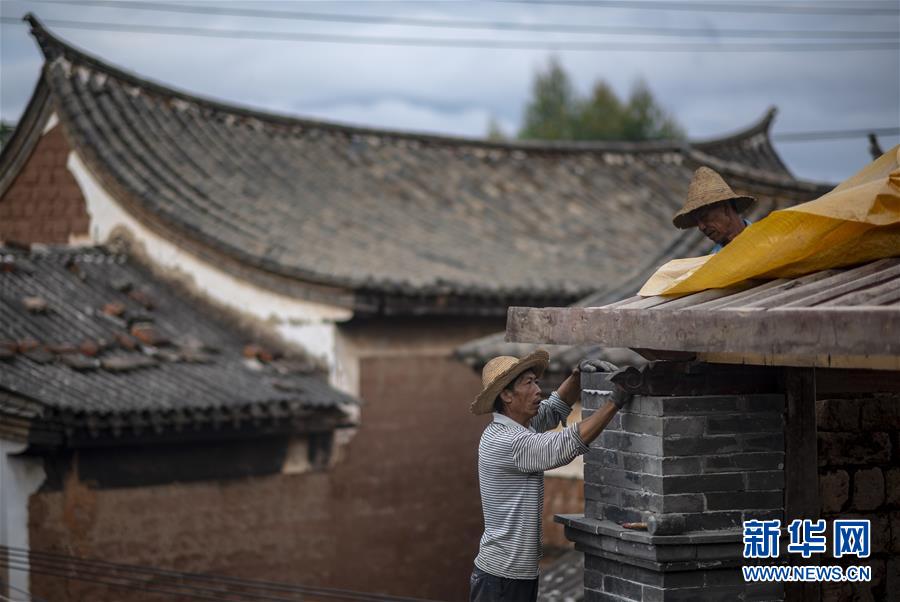 在石屏縣異龍鎮(zhèn)符家營(yíng)村211號(hào)民居,工人王艷華在修繕屋頂(8月8日攝)。新華社記者 江文耀 攝