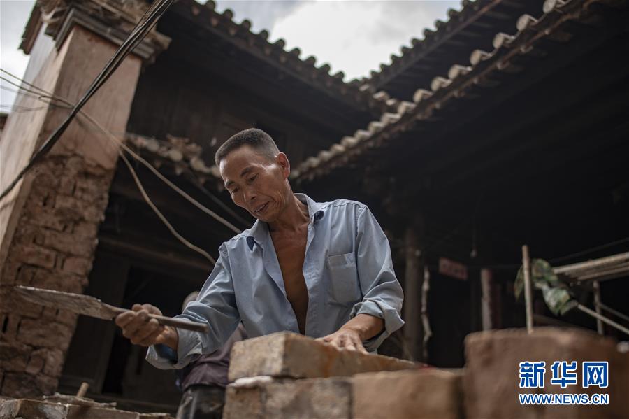 工人王建雄在修繕石屏縣異龍鎮(zhèn)符家營(yíng)村189號(hào)民居的圍墻(8月8日攝)。新華社記者 江文耀 攝