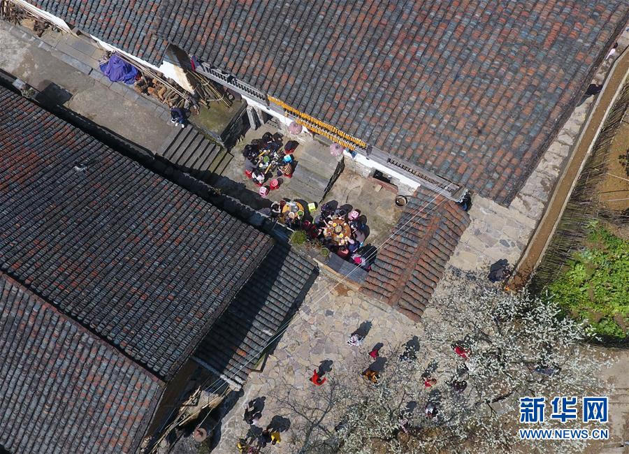 游客在龍革雄家的院子里吃午飯 (3月3日無人機(jī)拍攝)。 新華社記者 黃孝邦 攝