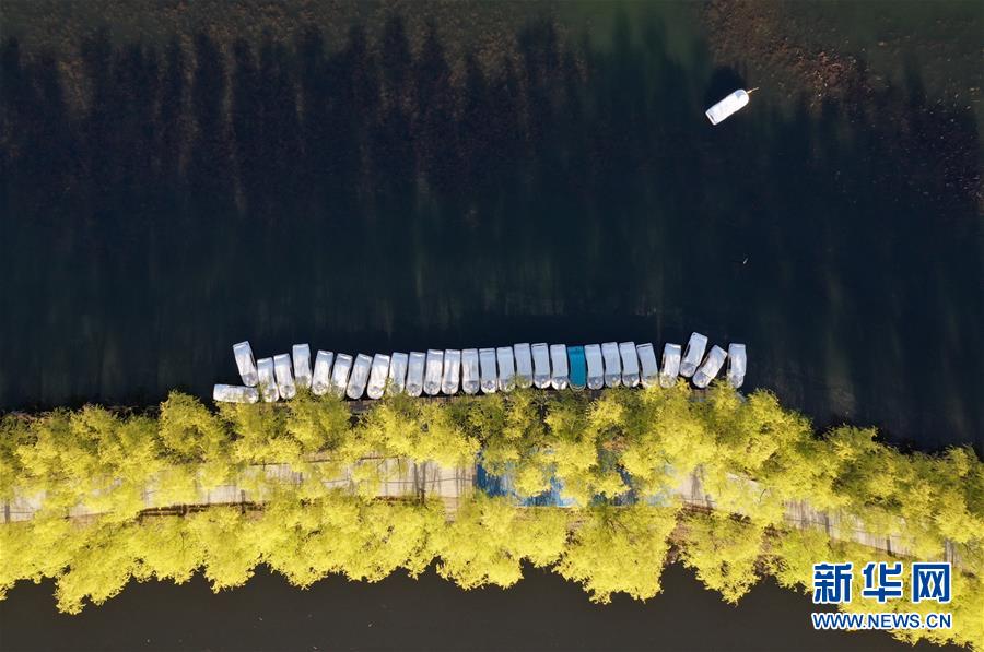 游船在白洋淀旅游碼頭內(nèi)行駛(4月10日無(wú)人機(jī)拍攝)。新華社記者牟宇攝